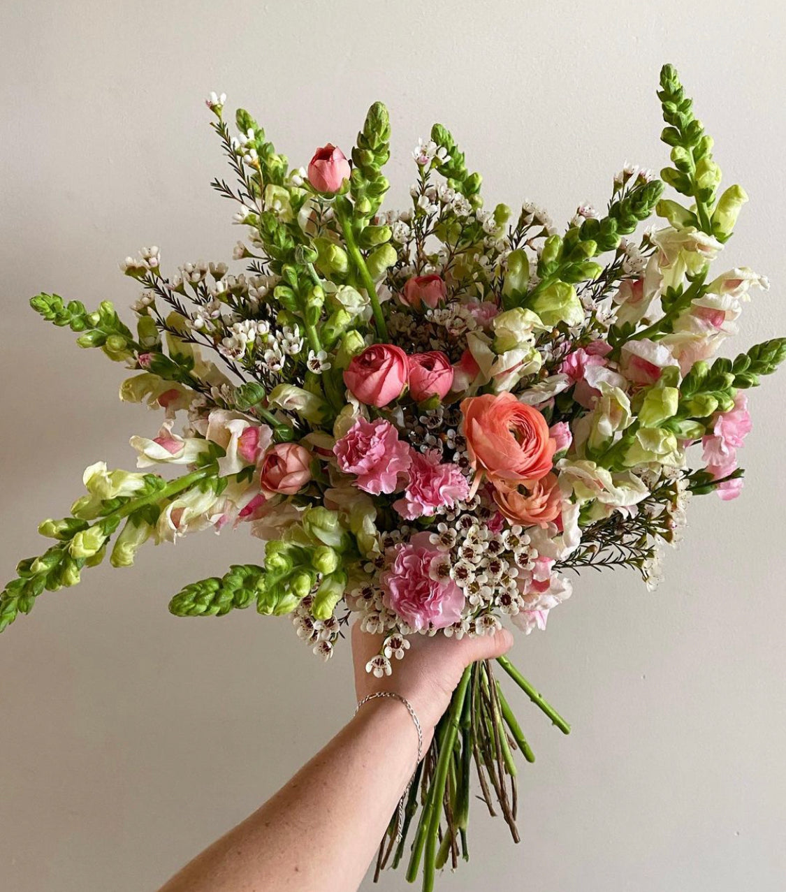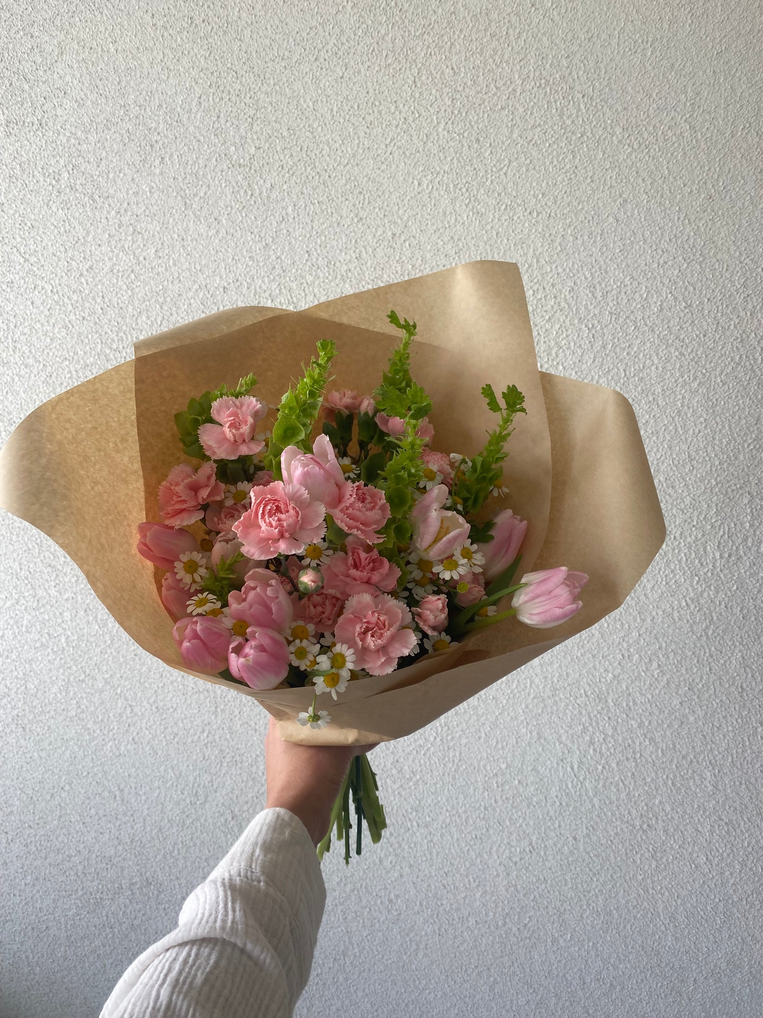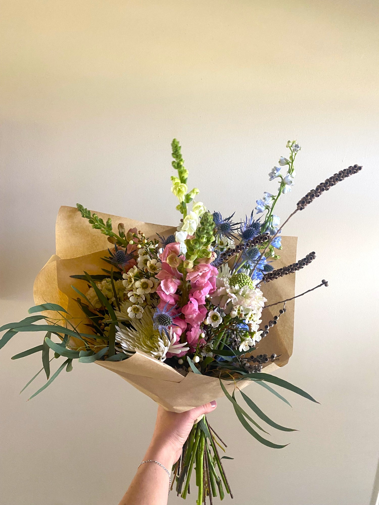 multiple varietal design wrapped in 100% recycled paper. this seasonal arrangement is locally sourced from southern california. bunches will vary each week depending on seasonal availability. this also ensures that you'll always be receiving the freshest blooms.